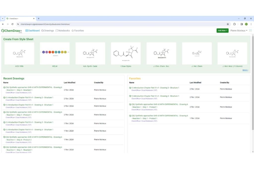 ChemDraw 与 Signals Notebook 等基于云的解决方案原生集成,这是唯一一款由 ChemDraw 驱动的化学电子实验记录本(ELN)。这种集成使用户能够在所有文档中执行结构搜索,创建和管理分子及反应集合,并通过几次点击在 Signals Notebook 中创建化学实验的演示报告。